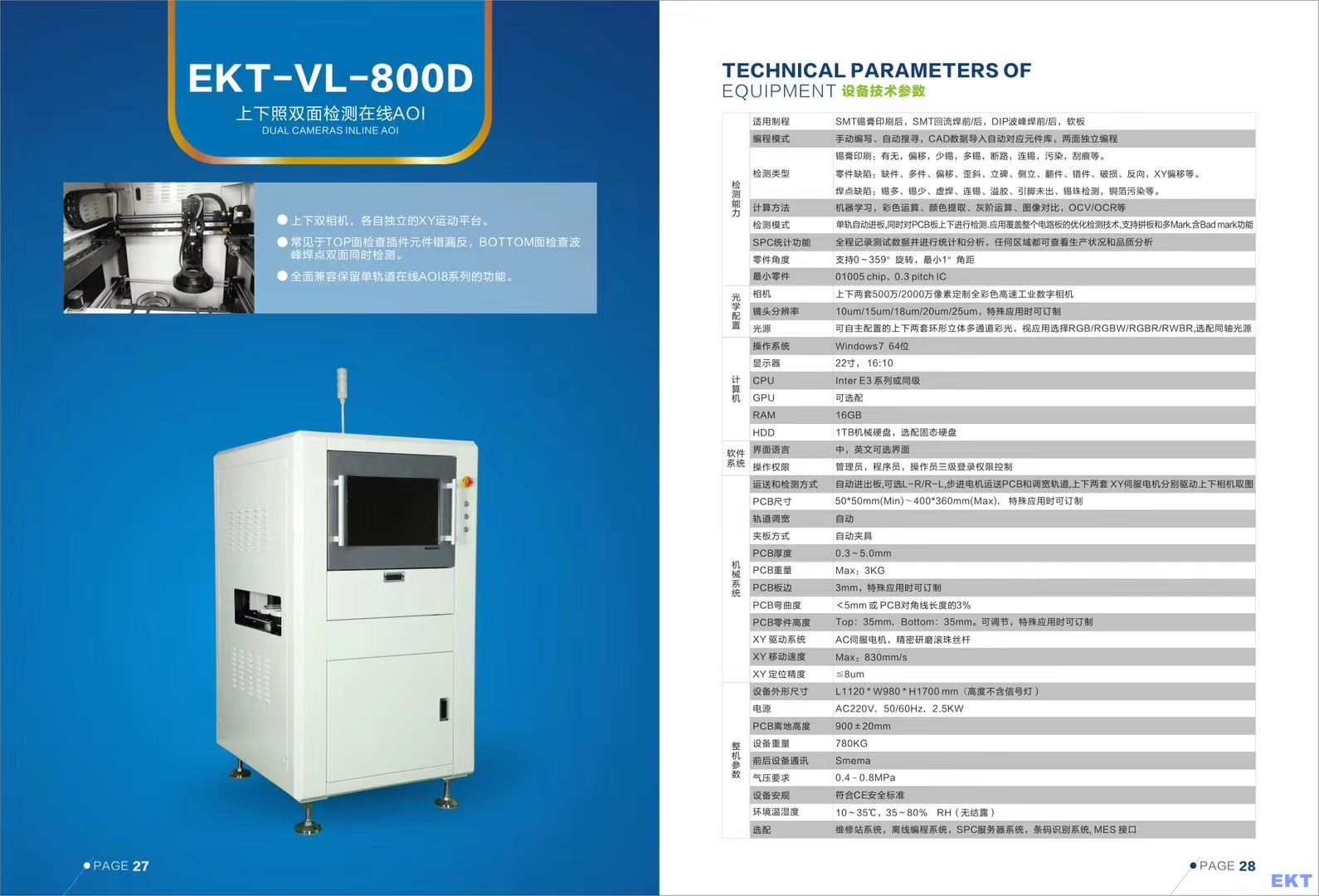 本公司自動光學檢測儀EKT-VL-800D是通過光學原理,綜合運用彩色運算,顏色提取,灰階運算,圖像對比等原理來檢查SMT生產線上貼裝原件的焊接質量、安裝狀態及錫膏印刷的效果,并將不良通過顯示終端輸出的專業產品。其特點是:上下雙相機,各自獨立的XY運動平臺,常見于TOP面檢查插件元件錯漏反,BOTTOM面檢查波峰焊點雙面同時檢測。
